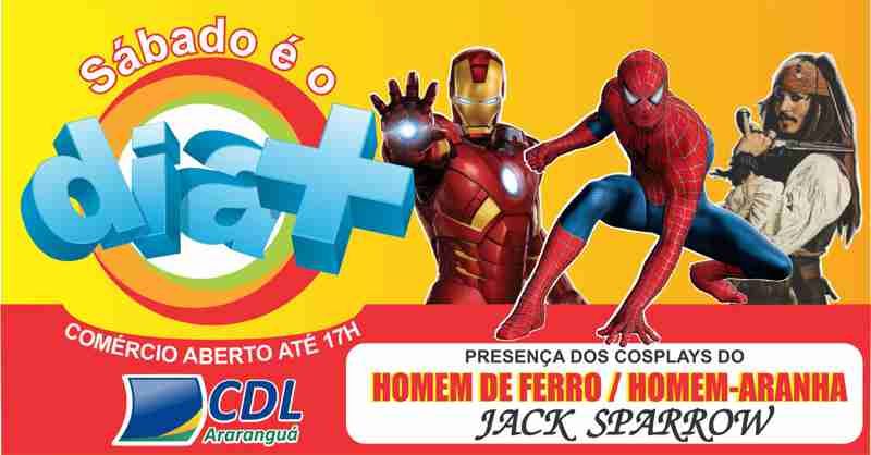 O Dia+ do próximo sábado (09), evento onde o comércio associado à Câmara de Dirigentes Lojistas (CDL) de Araranguá atende até às 17h, terá atrações especiais. Além das já tradicionais tendas, onde são oferecidos serviços e divulgações de entidades e associados, três personagens do cinema farão uma participação especial, que agradará os fãs de filmes de ação.